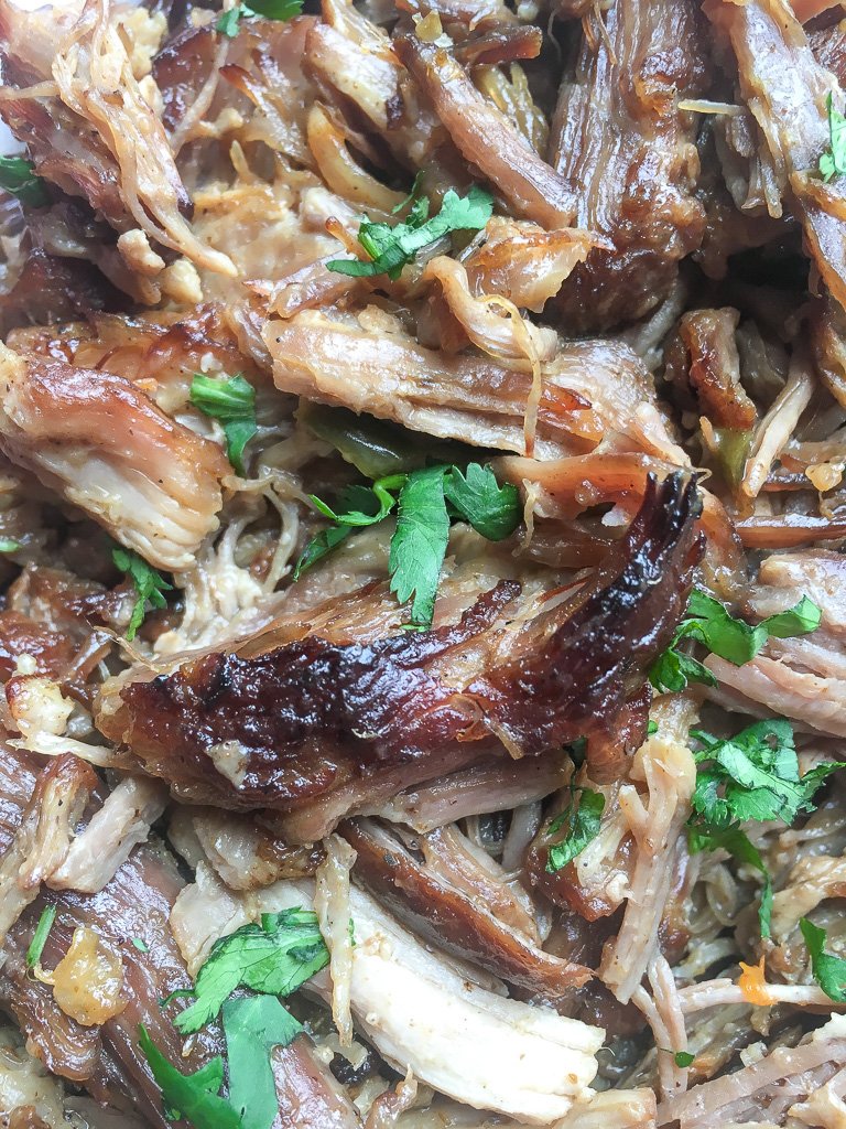 Preheat the oven broiler to high. Shred the pork on a baking sheet, drizzle with ¼ cup cooking liquid, and broil for 4-5 minutes or until crispy. Toss the pork and broil again for extra crispiness.
